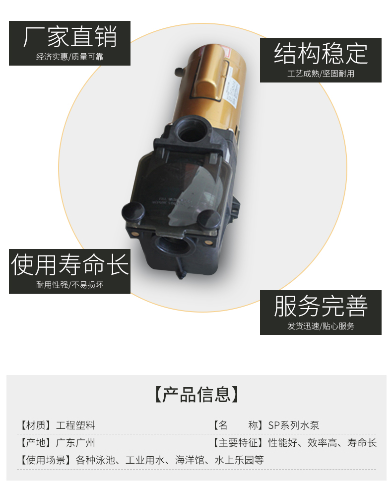 根據水力學原理設計的泵體,泵體、葉輪采用高強度工程塑料,經久耐用。濾藍容量大,大大減少了清洗工作。性能好,效率高,加快了注水(灌溉)速度并提高了能源效率。適用于各種泳池、工業用水、海洋館、水上樂園等。