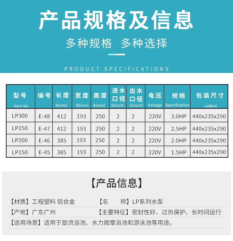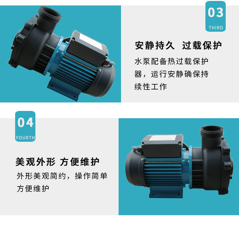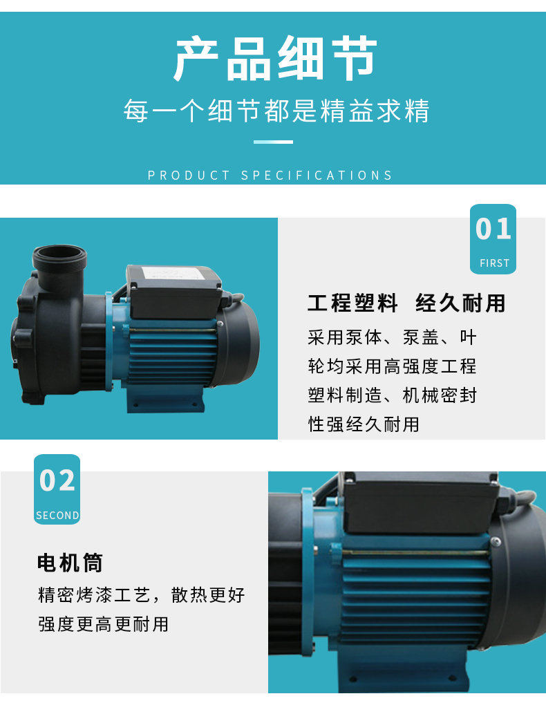 根據(jù)水力學(xué)原理設(shè)計的泵體,泵體、葉輪采用高強(qiáng)度工程塑料,經(jīng)久耐用。濾藍(lán)容量大,大大減少了清洗工作。性能好,效率高,加快了注水(灌溉)速度并提高了能源效率。適用于各種泳池、工業(yè)用水、海洋館、水上樂園等。